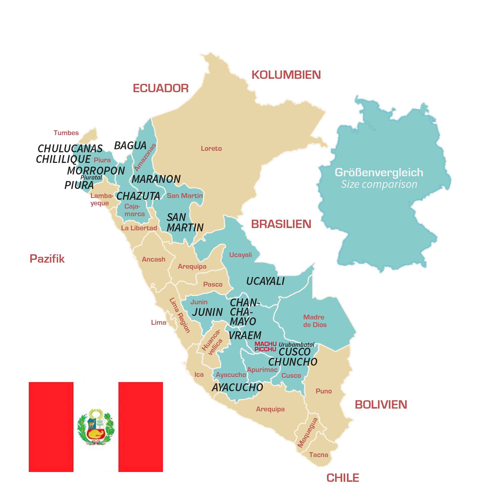 Le Pérou est un pays dont la production de cacao est relativement faible par rapport aux autres pays d'Amérique du Sud, mais le cacao péruvien est de la plus haute qualité. Sur la carte, nous avons indiqué les différentes régions de production de cacao (en majuscules) des chocolats.